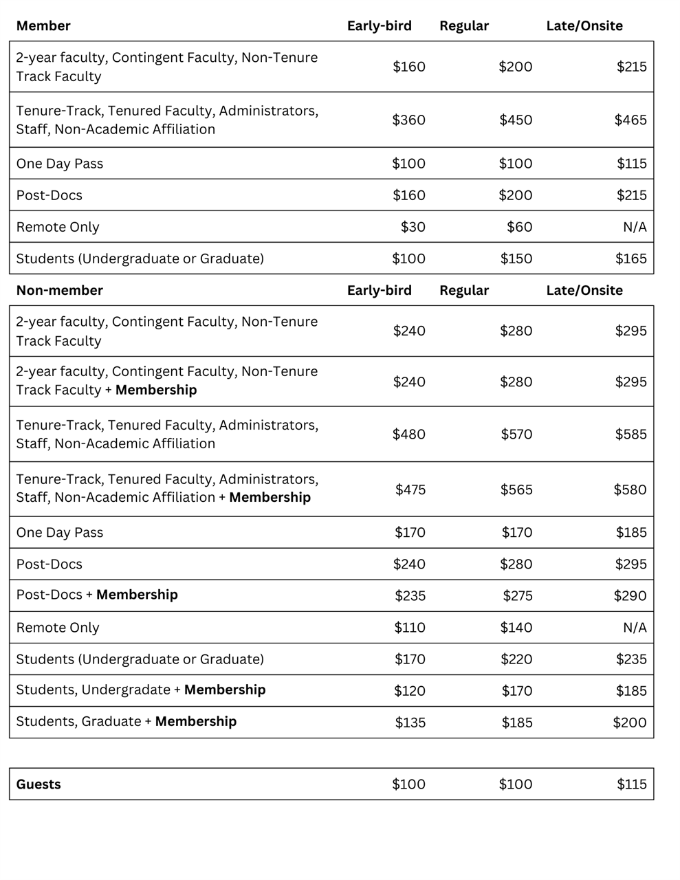 Guests of registered attendees are welcome to register for the annual meeting. This level will receive access to the poster sessions, the banquet, and boxed lunches. This registration level does not include conference proceedings such as keynotes and regular sessions. Individuals wishing to attend conference proceedings should purchase a regular registration option.